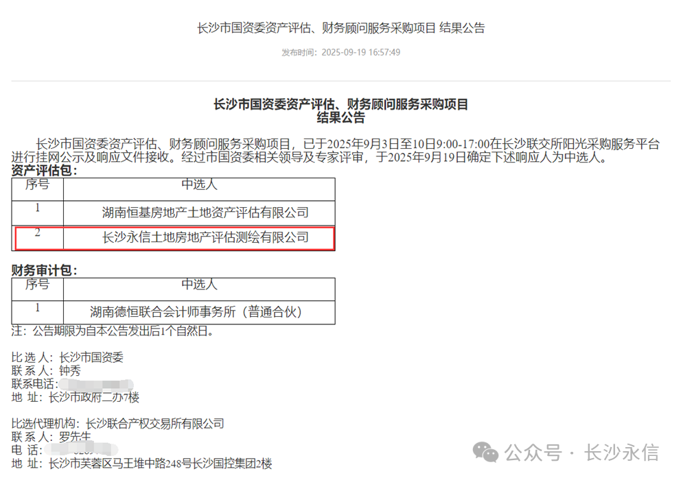据长沙市国资委于2025年9月的采购中标结果公告,我司凭借扎实的理论功底、丰富的实践经验和较强的业务能力,成功入选长沙市国资委资产评估顾问服务单位。本次采购是长沙市国资委为了保障企业国有资产评估质量,规范国有资产交易行为,充分发挥专家对相关专业和管理领域的技术把关和指导作用,切实提高评估质量,面向社会公开选聘三家中介机构(两家资产评估机构、一家会计师事务所),我司在众多中介机构角逐中成功中选。
