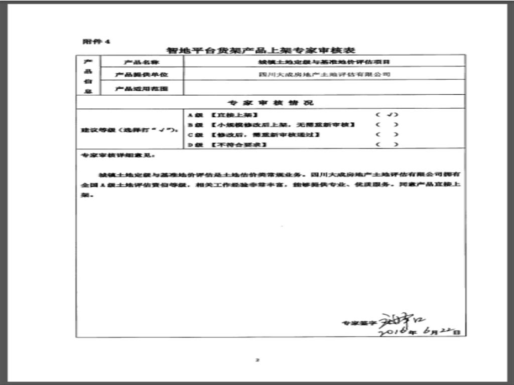 四川大成房地产土地评估有限公司具有中国土地估价师协会颁发的全国范围内执业(A级)土地评估机构注册证书,公司独立完成并通过验收基准地价更新项目共计数十余个,其中包含省会城市1个(成都市),地级城市8个,县级城市30余个,小城镇40余个。1、省会城市项目 四川大成公司2006年、2010年承担了四川省成都市中心城区两轮土地定级与基准地价更新项目,成果通过了四川省国土资源厅组织的专家技术验收,获得成都市国土资源局好评。2、地级城市项目 四川大成公司承担了地级城市8个(眉山市(三轮)、资阳市、西昌市、内江市、西藏林芝地区、南充市(两轮)、攀枝花市、乐山市等)土地定级与基准地价项目,均通过省国土资源厅专家验收。3、县城及乡镇项目 四川大成公司承担了县级城市30余个(双流县、龙泉驿区、温江区、郫县、新津县、都江堰市、崇州市、阆中市、简阳市、仁寿县等),小城镇20余个。